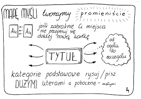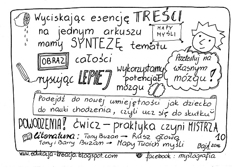 Można tam szczegółowo wgłębić się w temat. Jeśli natomiast chcemy poznać ogólne zasady powstawania map i to w bardzo przystępny sposób, zapraszam do zapoznania się z „Mapami myśli w 10 krokach” autorstwa pani Agaty Baj: (do pobrania w dobrej rozdzielczości tutaj):