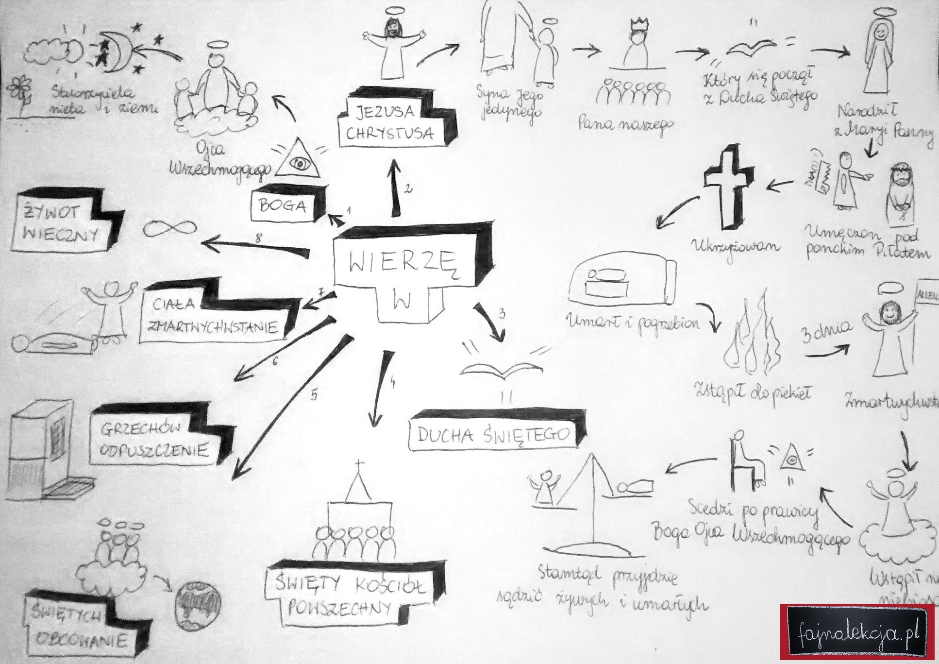 Doszłam więc do wniosku, że skoro te mapy myśli tak mi pomagają, to czemu nie używać ich w przekazywaniu wiedzy uczniom? Kto powiedział, że notatka musi być tylko tekstem? Możemy np. zapisując definicję na tablicy posługiwać się konkretnymi rysunkami, mniejszymi i większymi czcionkami, kolorowymi pisakami. Możemy np. modlitwę „Wierzę w Boga” przedstawić w taki sposób: