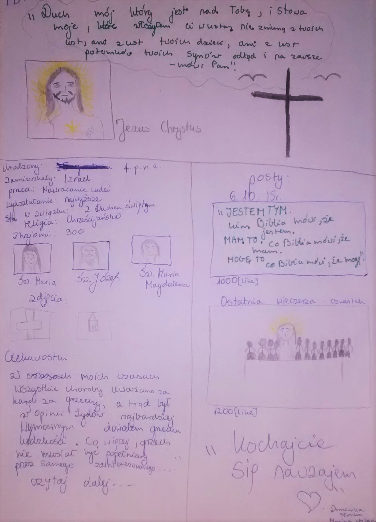 Żeby było ciekawiej, można także dać klasie do dyspozycji nieaktualne czasopisma, z których będą mogli wycinać i wklejać elementy do swojej pracy. Oto przykłady kilku prac moich uczniów, których zadaniem było wykonanie profilu Jezusa 🙂