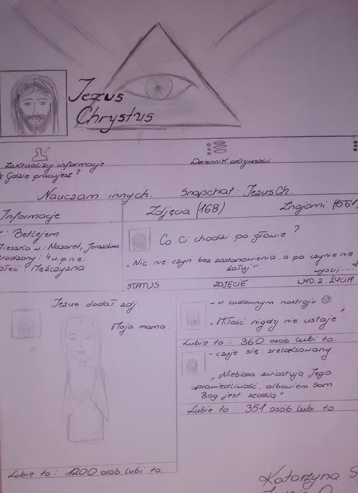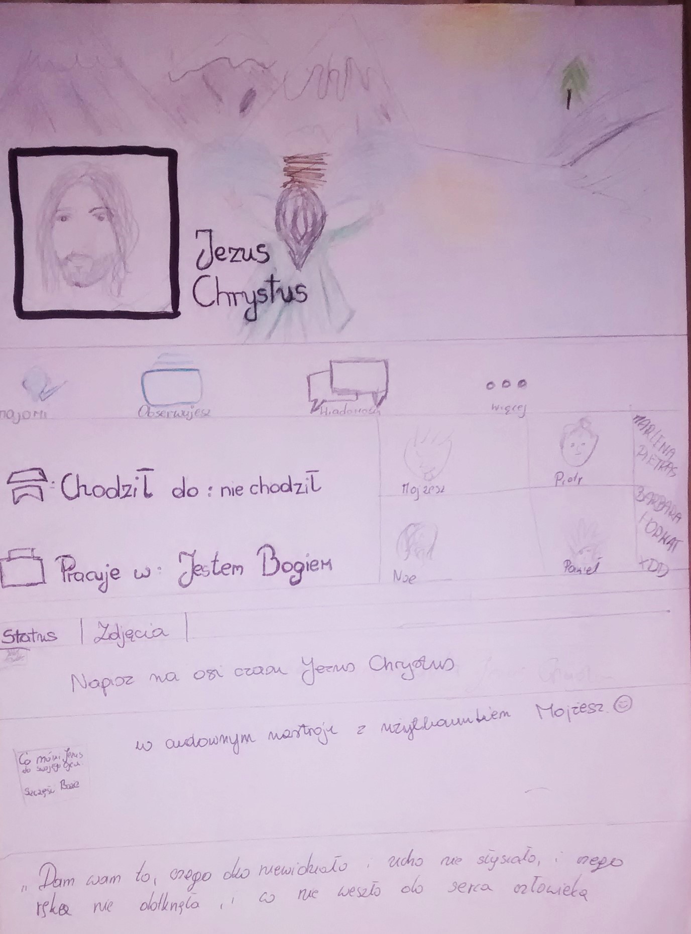 Poniżej podaję linki do czterech prac moich uczniów. Tak jak poprzednio, ich zadaniem było stworzenie profilu Jezusa 🙂